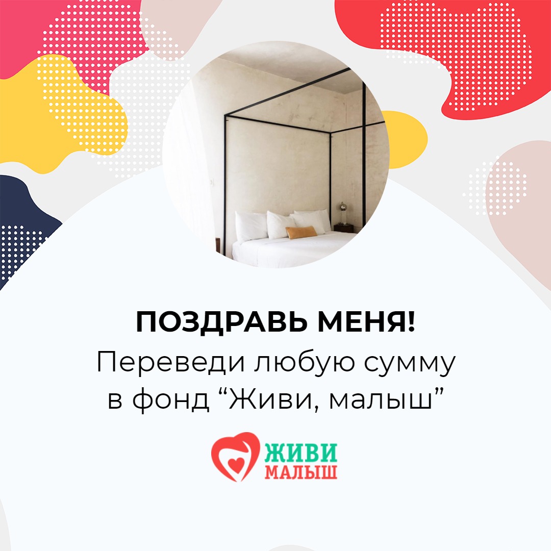 В свой день рождения я прошу вас помочь фонду “Живи, малыш”. Фонд занимается оплатой лечения и реабилитации детей, развивает службу бесплатного такси для детей инвалидов, обеспечивает расходными материалами детей с паллиативным статусом. Переведите любую сумму в фонд - это будет для меня лучшим поздравлением сегодня.