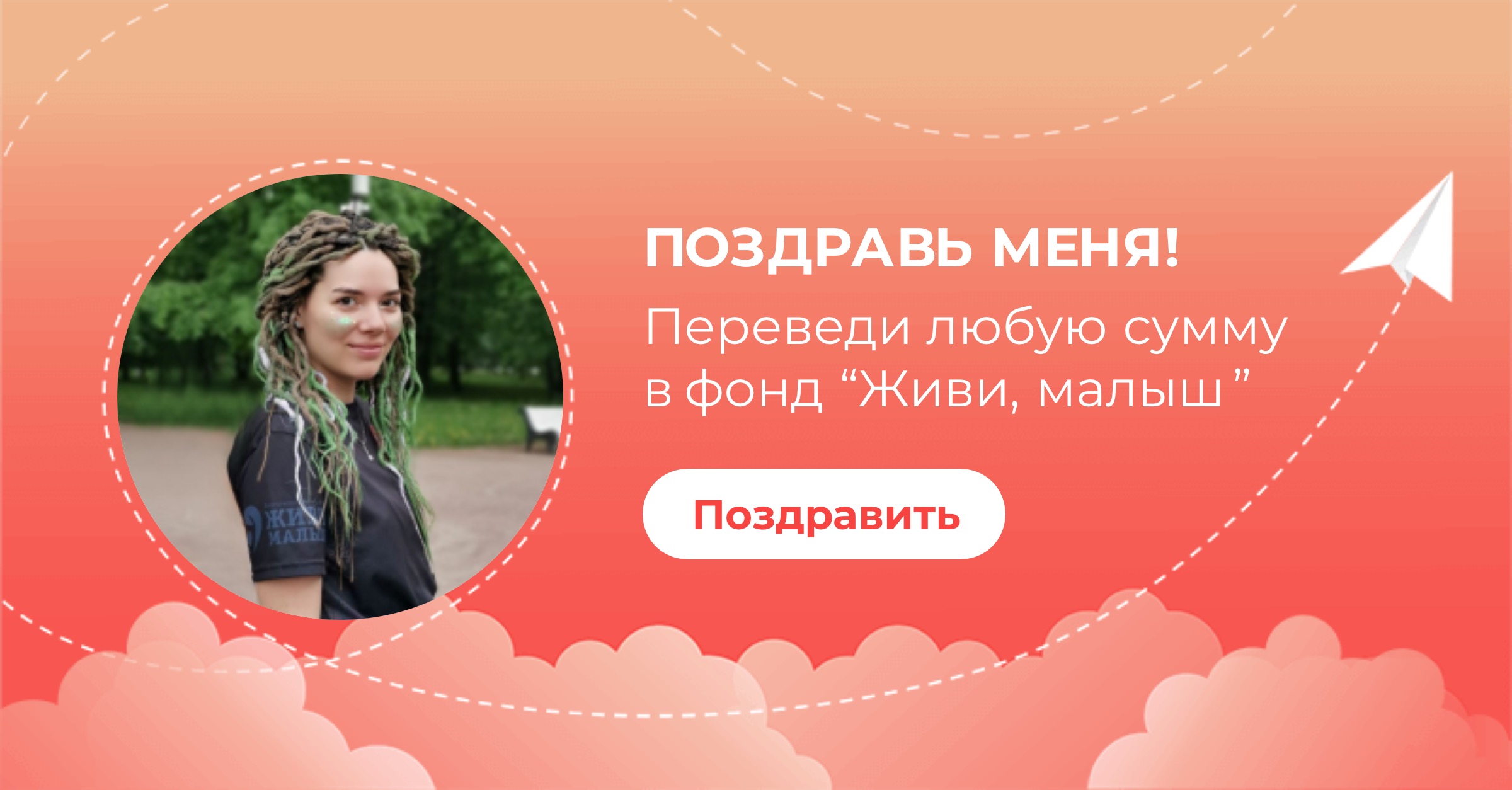В свой день рождения я прошу вас помочь фонду “Живи, малыш”. Фонд занимается оплатой лечения и реабилитации детей, развивает службу бесплатного такси для детей инвалидов, обеспечивает расходными материалами детей с паллиативным статусом. Переведите любую сумму в фонд - это будет для меня лучшим поздравлением сегодня.