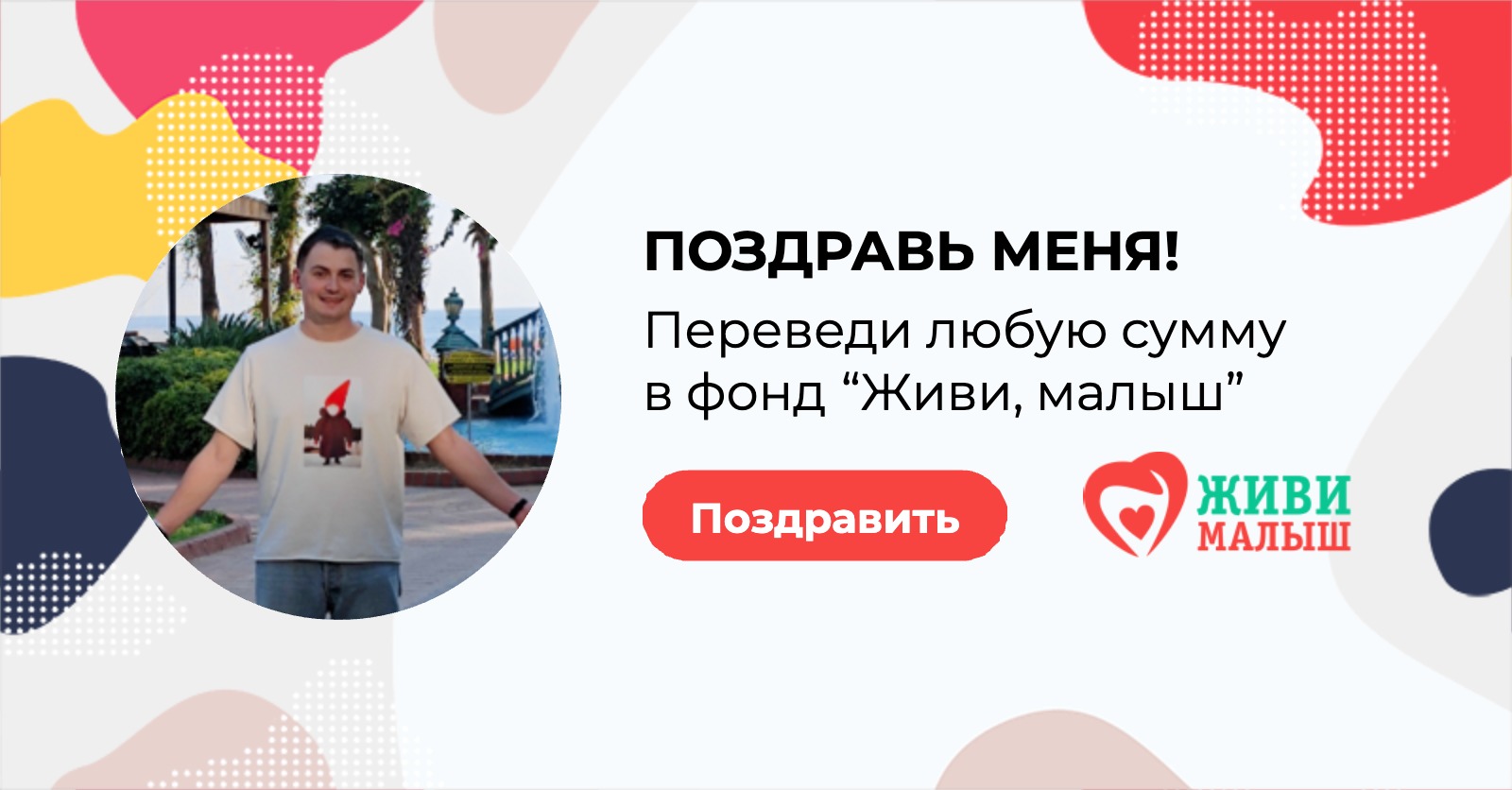 В свой день рождения я прошу вас помочь фонду “Живи, малыш”. Фонд занимается оплатой лечения и реабилитации детей, развивает службу бесплатного такси для детей инвалидов, обеспечивает расходными материалами детей с паллиативным статусом. Переведите любую сумму в фонд - это будет для меня лучшим поздравлением сегодня.