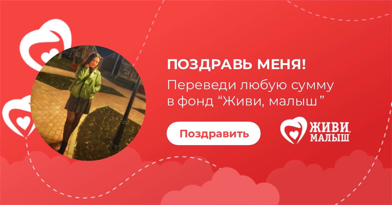 В свой день рождения я прошу вас помочь фонду “Живи, малыш”. Фонд занимается оплатой лечения и реабилитации детей, развивает службу бесплатного такси для детей инвалидов, обеспечивает расходными материалами детей с паллиативным статусом. Переведите любую сумму в фонд - это будет для меня лучшим поздравлением сегодня.
