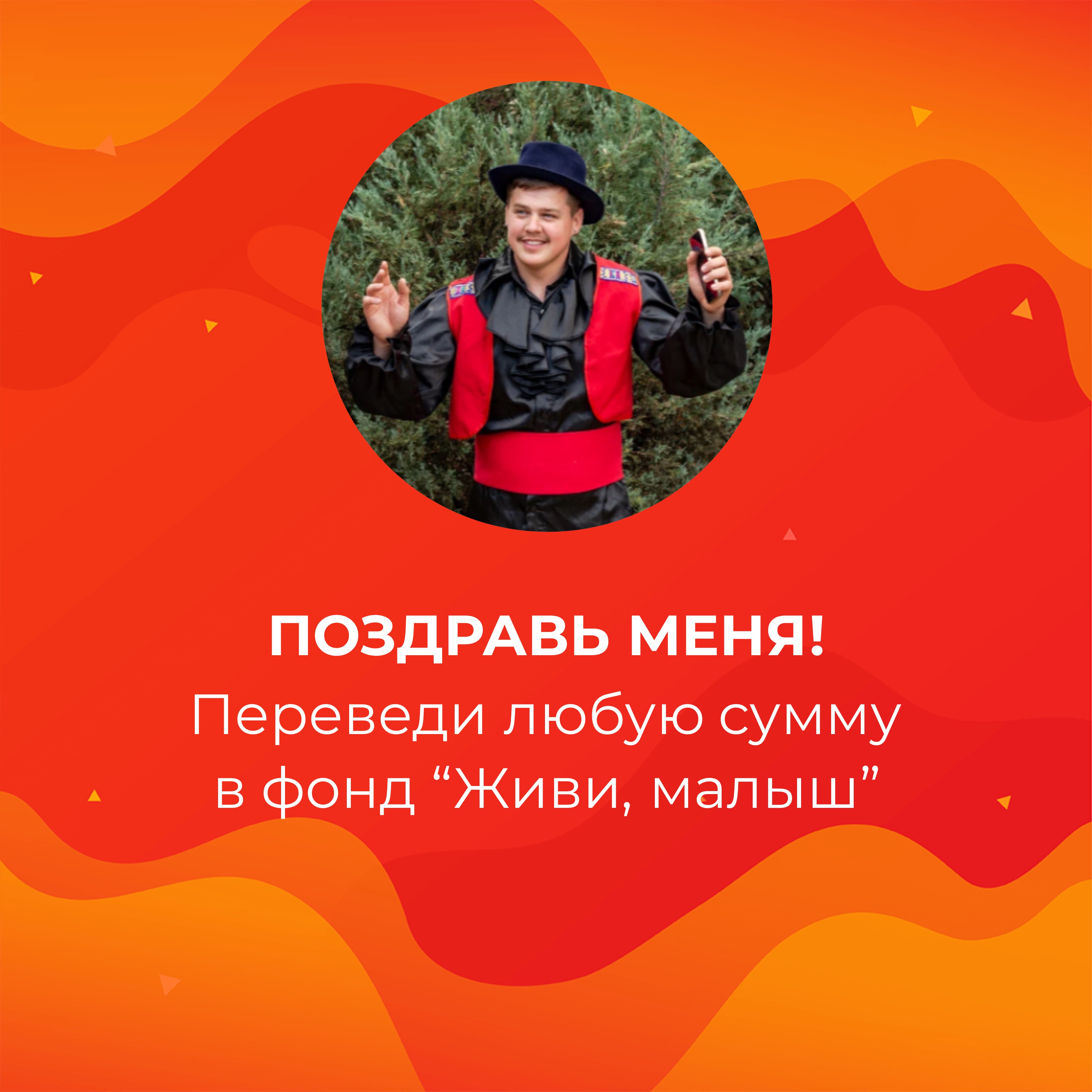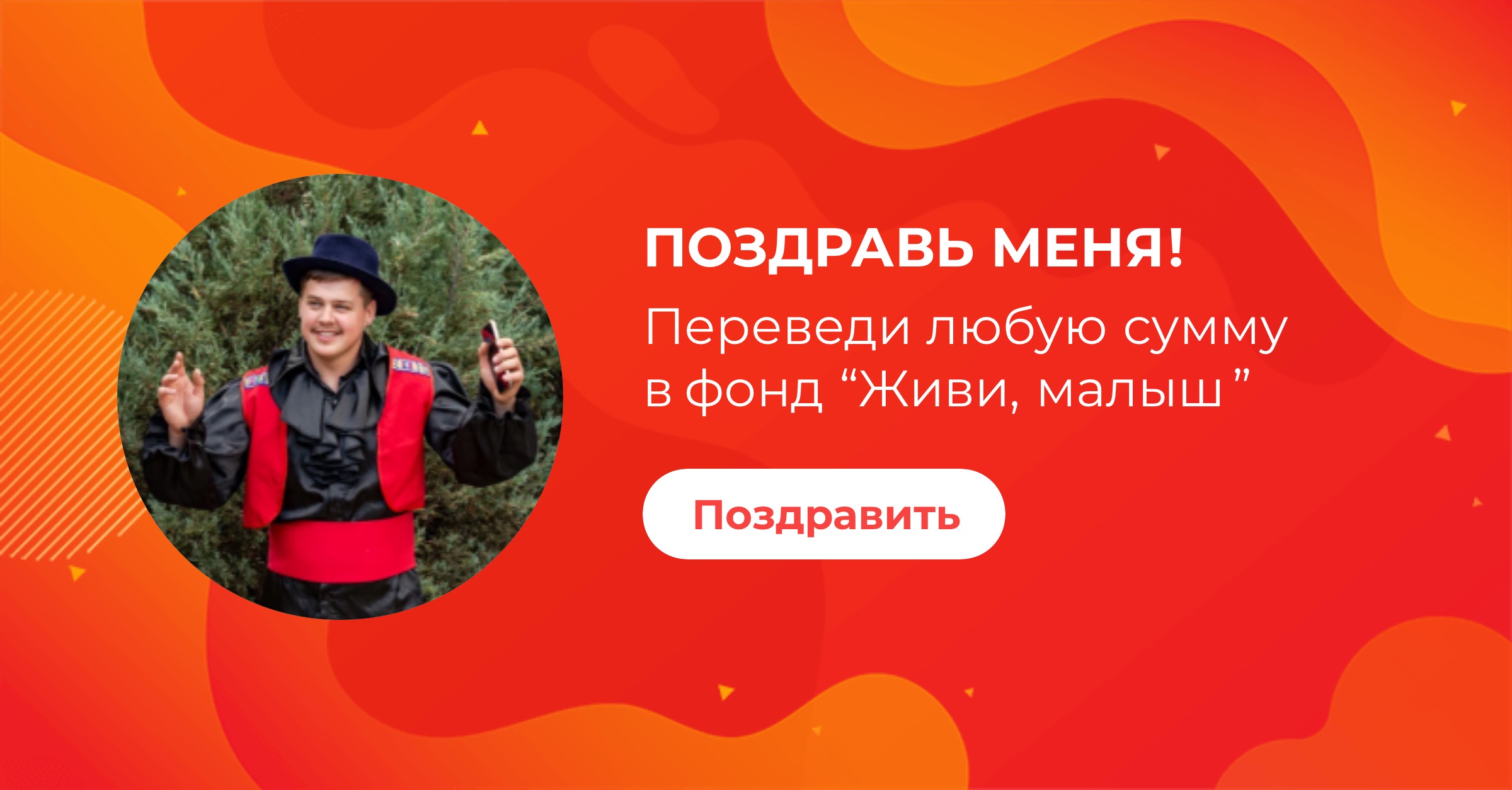 Привет, добрый человек! Мне от тебя ничего не надо, а вот есть те, кому помощь по-настоящему НЕОБХОДИМА. В свой день рождения я прошу тебя помочь фонду “Живи, малыш”. Фонд занимается оплатой лечения и реабилитации детей, развивает службу бесплатного такси для детей инвалидов. Переведите любую сумму в фонд - это будет для меня лучшим поздравлением сегодня. Спасибо большое! Добра тебе!
