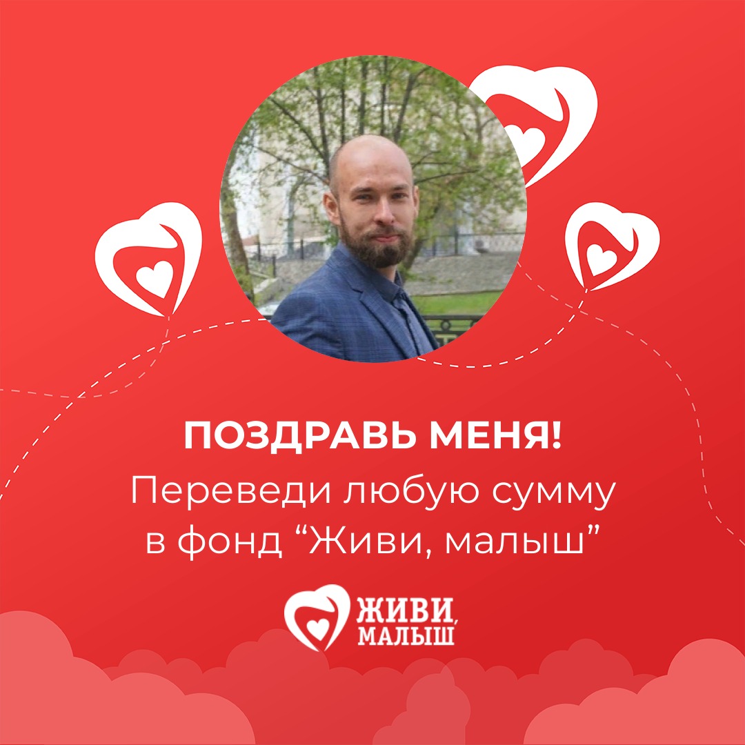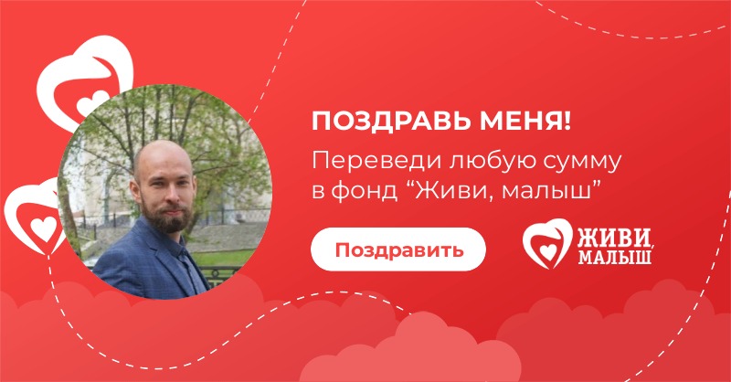 В свой день рождения я прошу вас помочь фонду “Живи, малыш”. Фонд занимается оплатой лечения и реабилитации детей, развивает службу бесплатного такси для детей инвалидов, обеспечивает расходными материалами детей с паллиативным статусом. Переведите любую сумму в фонд - это будет для меня лучшим поздравлением сегодня.