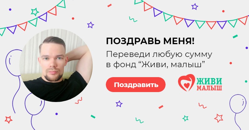 В свой день рождения я прошу вас помочь фонду “Живи, малыш”. Фонд занимается оплатой лечения и реабилитации детей, развивает службу бесплатного такси для детей инвалидов, обеспечивает расходными материалами детей с паллиативным статусом. Переведите любую сумму в фонд - это будет для меня лучшим поздравлением сегодня.