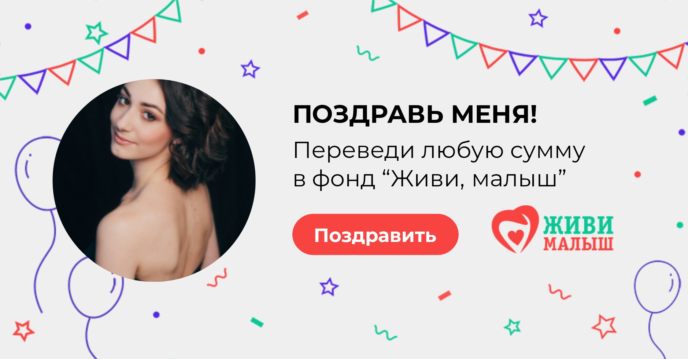 Сегодня у меня день рождения, и вместо поздравлений и подарков я прошу вас помочь фонду “Живи, малыш”. Переведите любую сумму в фонд - это будет для меня лучшим поздравлением сегодня.