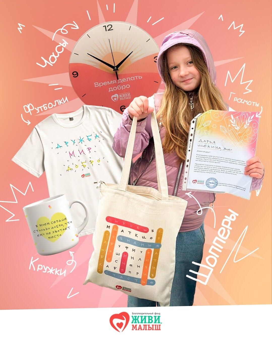 Мы вместе с нашим чудесным дизайнером Машей сделали новый мерч фонда «Живи, малыш» – футболки, шопперы, кружки и даже часы. За них большое спасибо мастеру Дмитрию Быкову, который уже три года делает для нас замечательные кварцевые модели с нашими уникальными рисунками. Дмитрий – человек с золотыми руками и большим сердцем, и мы очень рады, что он с нами.